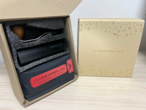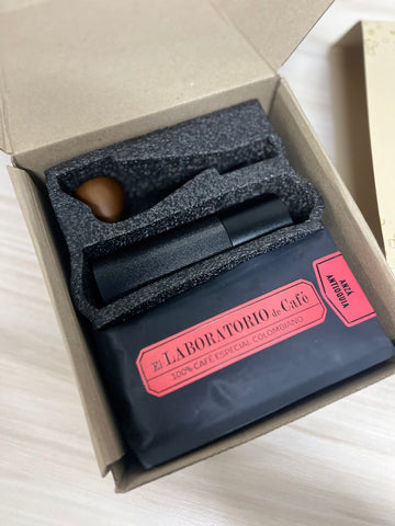 Empacado en caja, incluye bolsa de café 340 gr y 1 molino manual en acero inoxidable